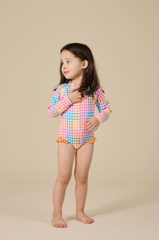 Goldie + Ace Rainbow Gingham Long Sleeve Frill Swimsuit