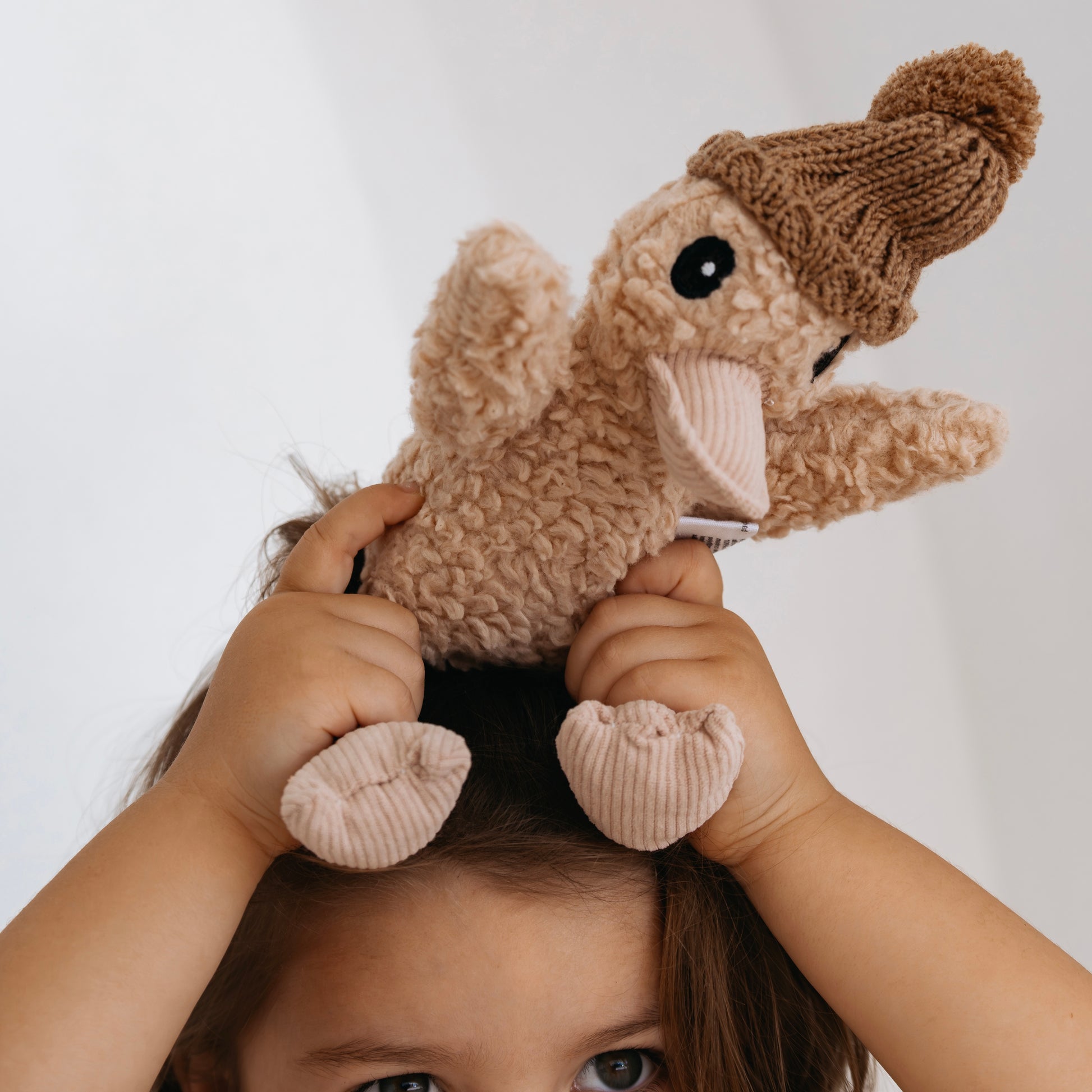 Introducing Poppy Duck, tje unique and quirky plush forever friend. Made with super soft cotton fabric, and accented with soft pink corduroy, Poppy likes to keep warm in her caramel Australian merino wool knitted beanie. She loves planting and watching seeds grow in her garden, playing with her dog Spike, and snuggling together at night.