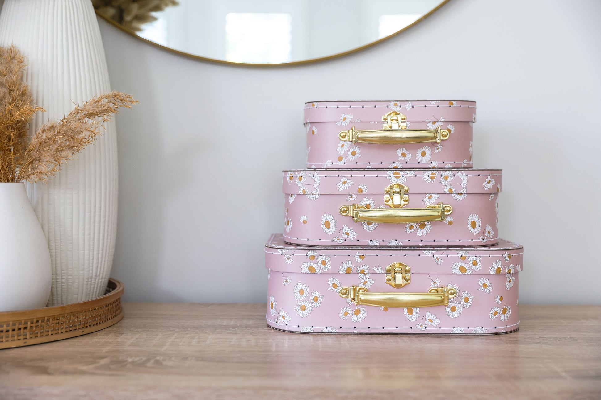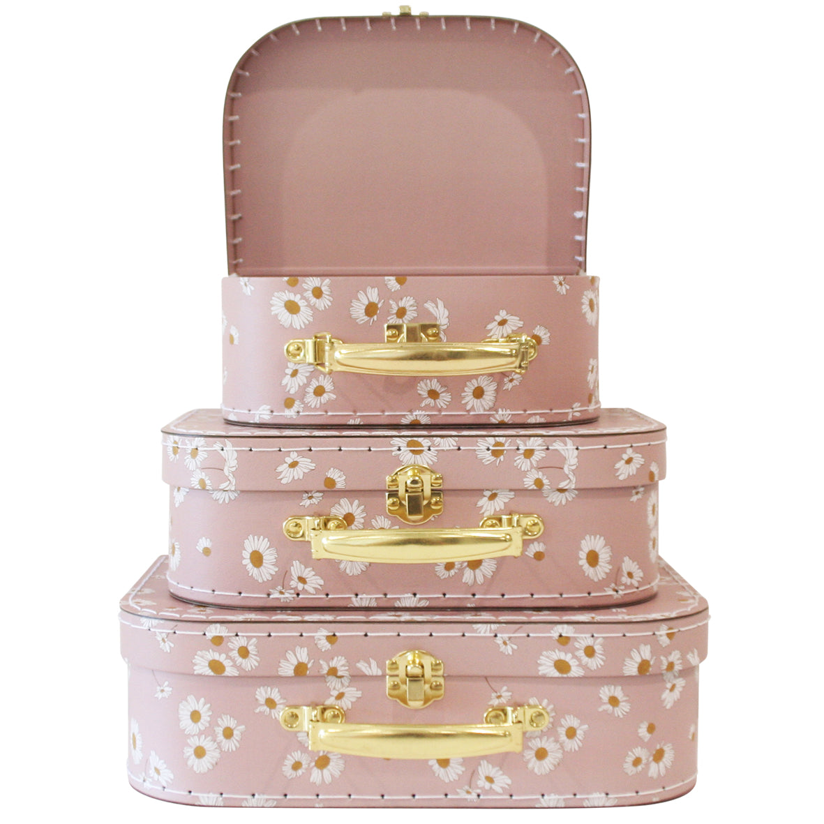 Set Daisy Days, a versatile and captivating solution for your child's storage needs. Designed to be light enough for little hands yet elegant enough for keepsake storage, this set comes with the added benefit of nesting style for convenient shipping and storage. Let's explore the outstanding features that make this set a must-have: