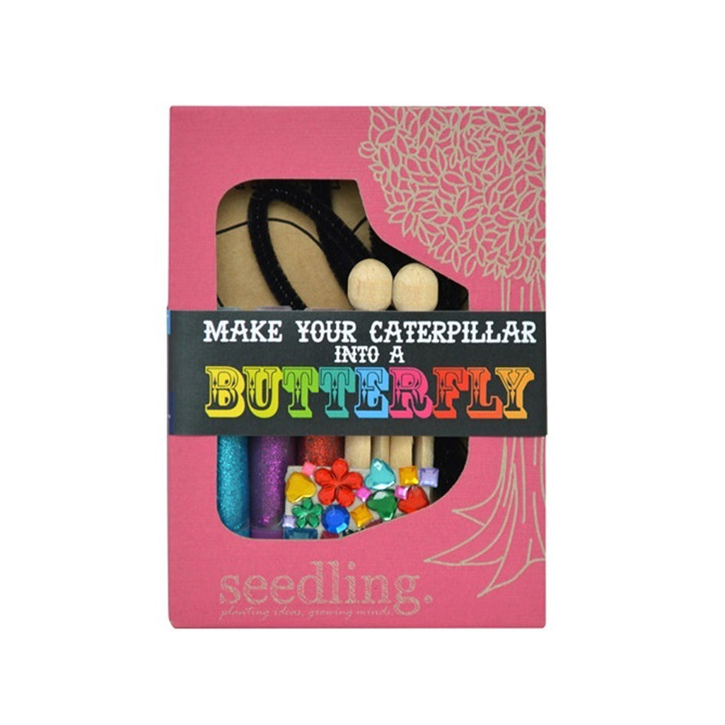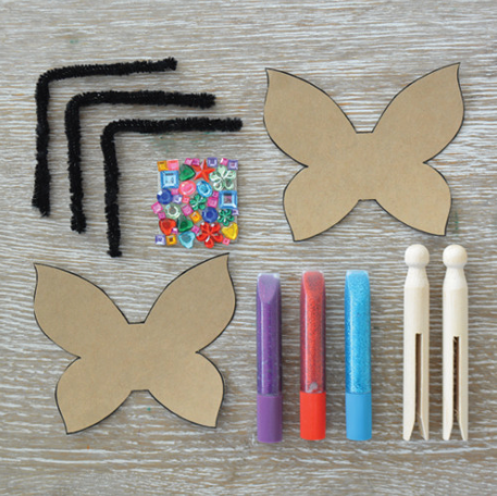 Kit includes: Wooden pegs, butterfly shaped wings, sparkly rhinestones, glitter glue and instructions.