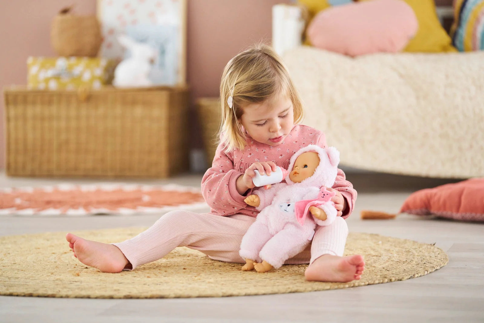 Bébé Calin Loving Teddy Bear's soft body is poseable, like a real baby. The doll's blue sleepy eyes close when it's put down for a nap or at bedtime, also like a real baby. Bébé Calin Loving Teddy Bear's furry "suit" is removable to reveal a printed body. The doll scomes complete with a feeding bottle and lovey and is part of the mon premier poupon Corolle collection of dolls, clothing and accessories for early nurturing time.
