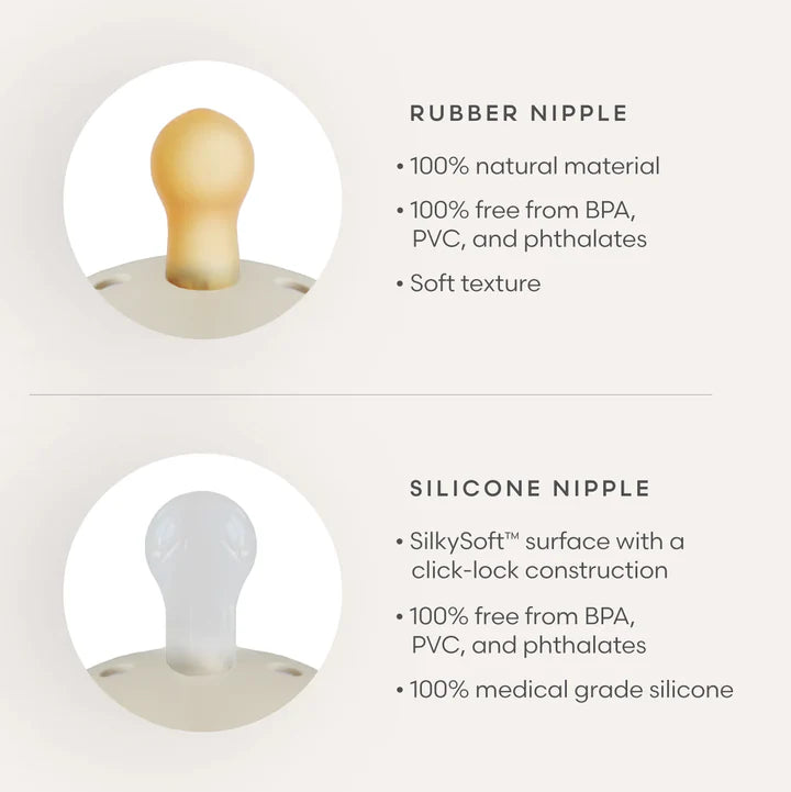 Natural rubber pacifiers may experience texture changes over time from exposure to extreme temperatures, humidity or direct sunlight. Please replace the pacifier if the rubber material weakens with a tacky or sticky texture. This is within the normal life cycle for natural rubber products.