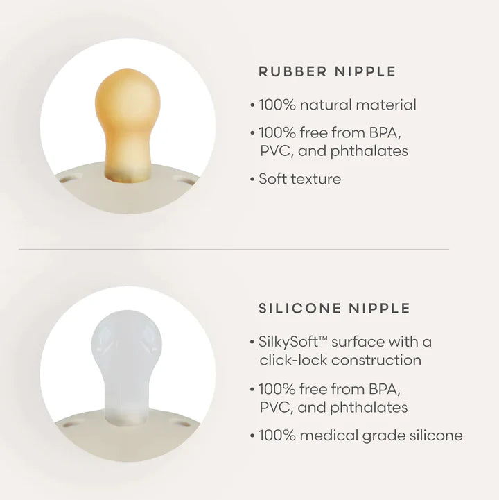 Natural rubber pacifiers may experience texture changes over time from exposure to extreme temperatures, humidity or direct sunlight. Please replace the pacifier if the rubber material weakens with a tacky or sticky texture. This is within the normal life cycle for natural rubber products.