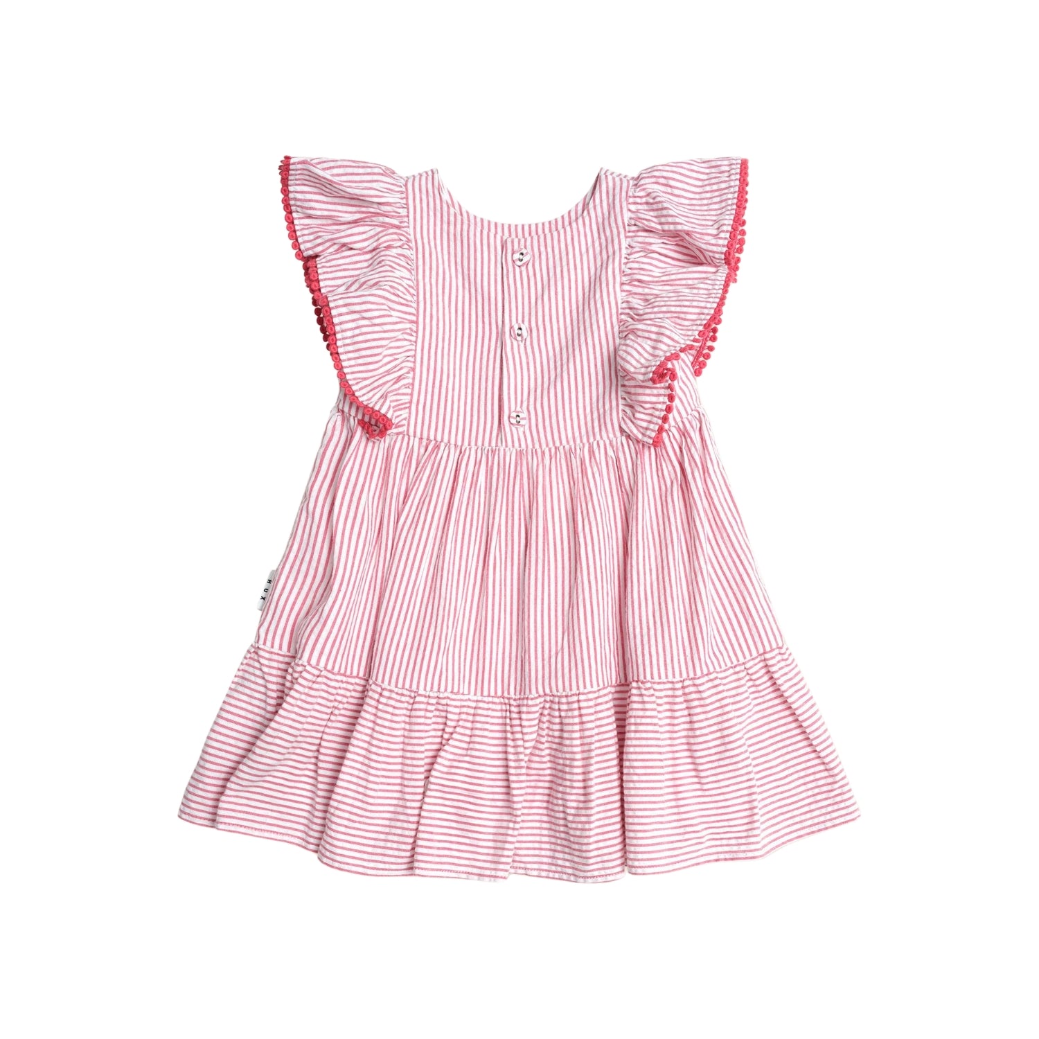 Event dressing, made easy. Made from 100% cotton, this dress features oversized frill sleeves and a full, tiered skirt just waiting to be twirled. Light, breezy and in our super sweet cherry stripe, this piece features detailed cherry embroideries along the front hemline.