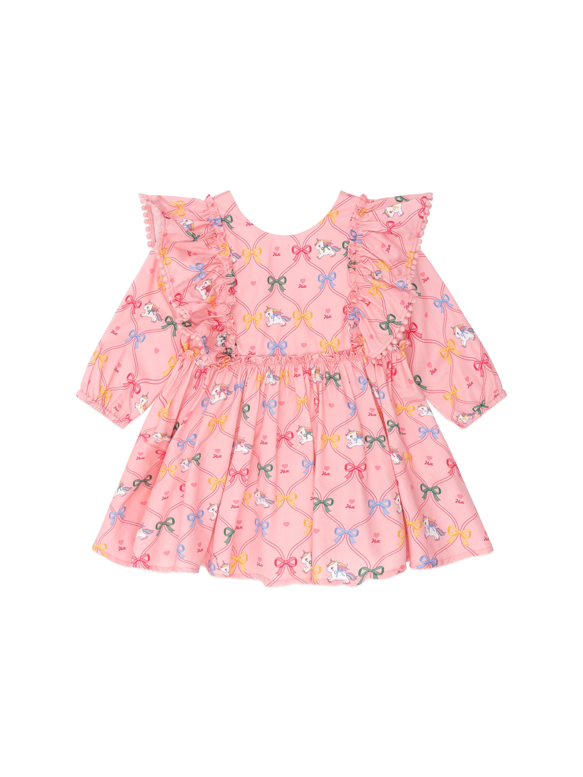 The sweetest classic vintage style frill dress. Made from soft 100% organic cotton, it features pretty frilly on the sleeves, a bow at the back, an all-over unicorn patternl, a full, tiered skirt and exaggerated puff sleeves.
