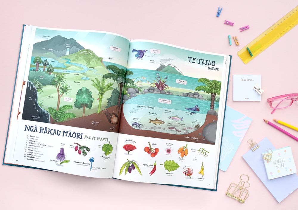 A hard-cover book with 68 fully illustrated pages, in a large format (266 x 320mm), in vibrant full colour, with over 1000 te reo Māori words, translated into English. Embedded with gorgeous Kuwi the kiwi (and friends) illustrations.