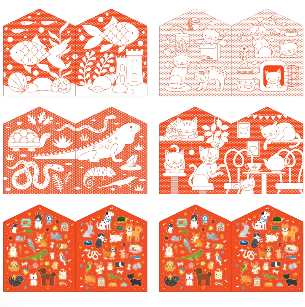 Color in the sweet scenes filled with favorite animals, including cats, dogs, bunnies, and birds. Then add the finishing touch with over 100 pet-themed stickers!