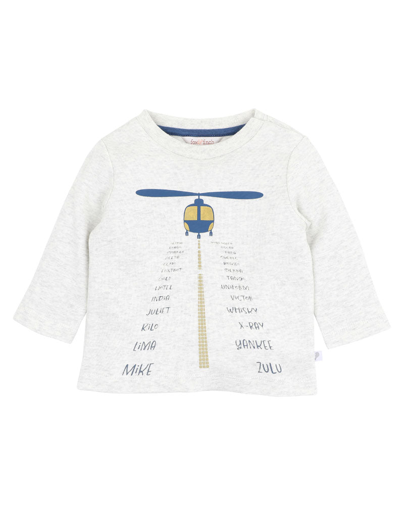This long sleeve crew neck tee features a fun graphic on the front, concealed press stud shoulder opening and rib neck band, making it a great basic for your little one's Winter wardrobe to wear back with the Boys pull on jeans or High Flyer track pants for a complete outfit.