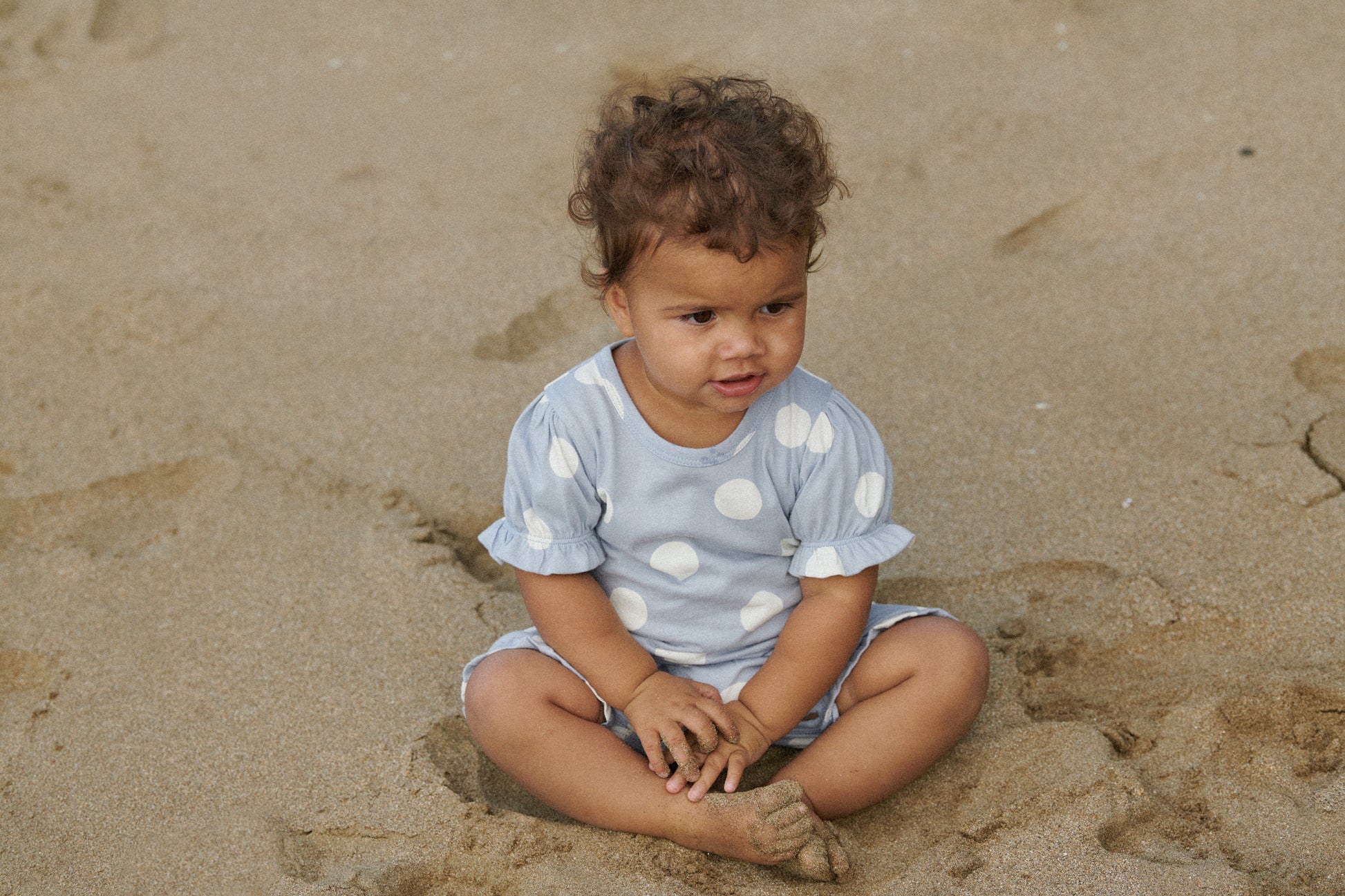 The Bubbles Suit is the perfect all in one for your little one's summer adventures. Featuring cute gathered puff sleeves with elasticated frill hem and convenient snap YKK domes at inseam for easy dressing.