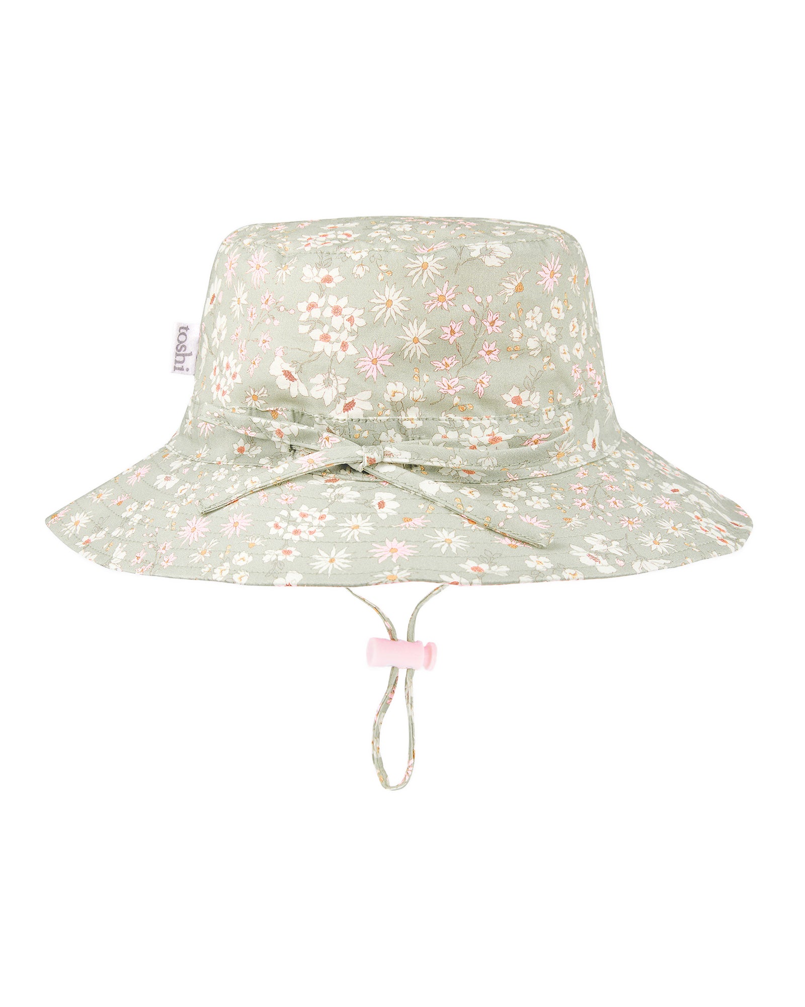 Toshi presents the classic Sunhat Eva, ideal for children of all ages. The broad and well-structured brim offers increased sun protection. A head tie creates adjustable sizing and the chin tie with toggle secures the hat for ease of wear. The security release clasp on the chin tie is designed to enhance wearer safety. The classic Toshi Sunhat is crafted from the finest quality 100% cotton and is fully lined for additional comfort. An original and exclusive Toshi print design is featured.